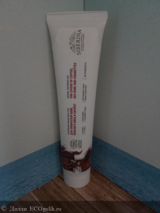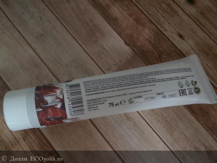 Всем привет, дорогие друзья. Сегодня мы продолжим знакомиться с разными средствами от марки "Siberina" и у нас на повестке дня зубная паста с натуральным составом для любителей кофе, сигарет и красного вина. Я из этого люблю только кофе, пью его каждый день. Вино вообще не пью, сигареты тоже не употребляю. Но пасту все-таки решила попробовать, чтобы избавиться от налета от кофе. И она в этом деле очень хорошо помогает. Правда, ее для этого нужно использовать какое-то количество времени. Продается паста без коробочки, это тоже очень хорошо. Нравится, что компания заботится о природе. Посмотрим, как выглядит эта зубная паста.