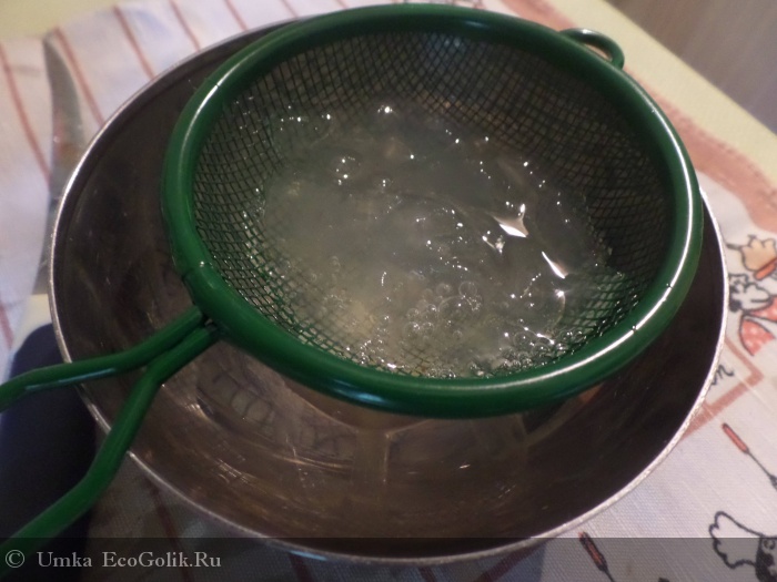 Ну а что бы он стал более жидким воспользуемся сито и пропустим гель через него,помогая себе ложкой.