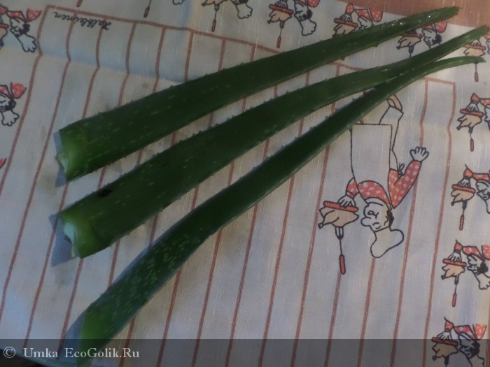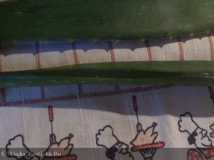 У листьев мы срезаем колючки и сухую часть листа,а так же если есть какие то испорченные части.То что находится внутри и есть искомое-гель.