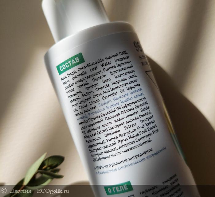 В составе есть частички пемзы, которые дают скрабирующий эффект. Есть противовоспалительные компоненты - шалфей, береза, морская соль. В основе мягкий растительный ПАВ. Эфирные масла лимона и мяты тонизируют и освежают кожу.