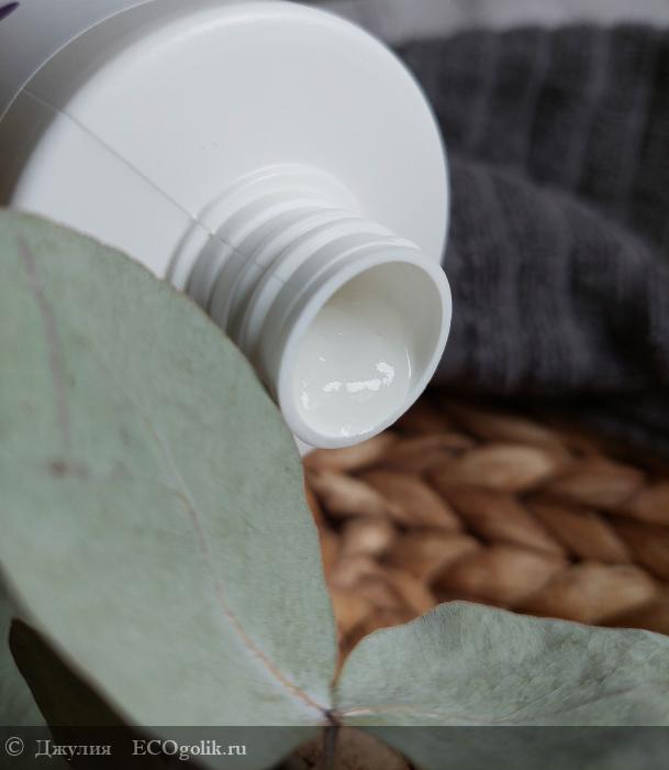 Крышка обычная флип-топ. А сама пенка очень густая, по цвету белесый гель консистенции студня. В дозаторе отверстие узкое, поэтому приходится выдавливать… Благо упаковка позволяет надавить на нее.