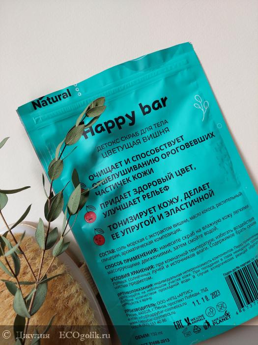 Иногда для разнообразия я покупаю сухие скрабы для тела. У меня уже есть два фаворита скрабов такого формата, но захотелось попробовать что-то новое. И выбор пал на марку Happy Bar. Как я поняла это дочерняя марка Organic zone и др. Привлек красивый дизайн и бюджетная цена.