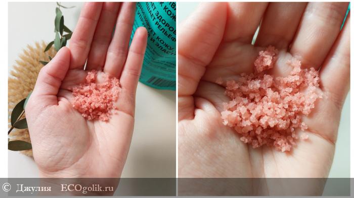 Аромат у скраба бомбический! Он напоминает знакомые многим скрабы Innature или Ecocraft. Текстура у него сухая, даже слишком… Масла вообще не чувствуется. Либо оно испарилось, либо его там крайне мало. Даже маслянистого следа не остается на коже. Частицы соли крупные, с первого взгляда я поняла, что он будет агрессивный.