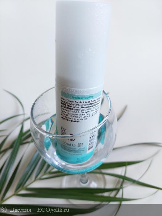Состав достаточно простой основа с экстрактами опунции, алоэ и гамамелиса. Каждое из этих компонентов не только увлажняет, но и успокаивает кожу. Наверняка кого-то может смутить спирт в начале состава, но он тут выступает, как консервант. Ну и к тому же это не классический денатурированный спирт. При нанесении запаха не чувствуется и сухости средство не дает.