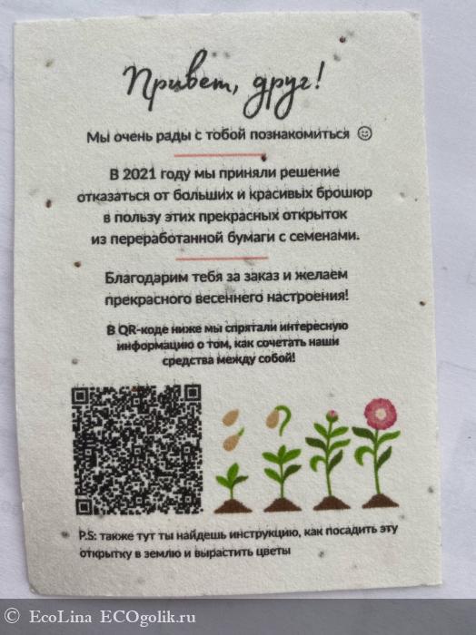 Но и это еще не все. На фото выше видно как в комплекте идет небольшая милая открытка, но если её перевернуть на обратную сторону, то здесь тоже есть информация о том, как можно в дальнейшем её утилизировать. Это не просто открытка, а бумажка с семенами из которых потом вырастут цветы.
