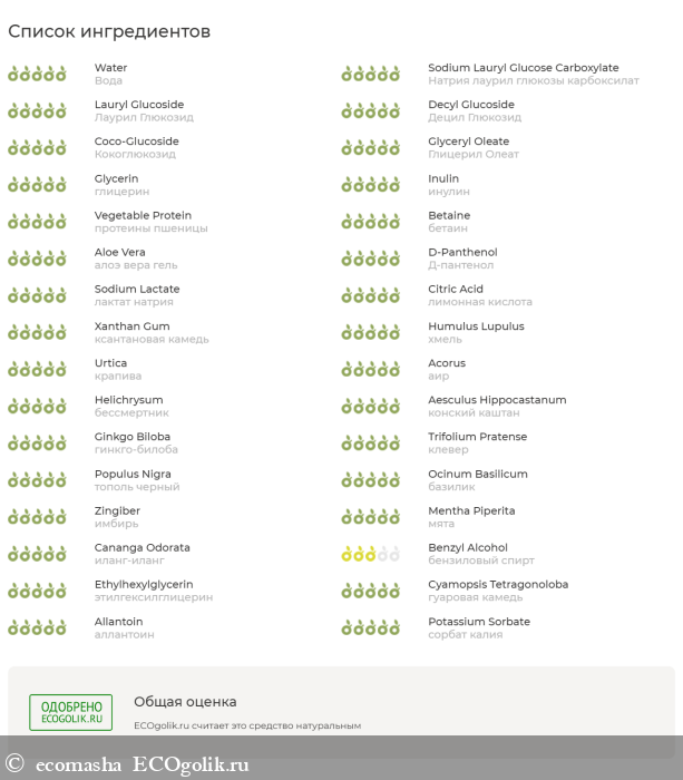 Очень примечательный у этого шампуня состав. Состав богат маслами, травами (аир, клевер, мята, конский каштан, крапива, протеины пшеницы). Они обладают мощным укрепляющим воздействием на волосы, а также улучшают состояние кожи головы за счет увлажнения и укрепления корней.