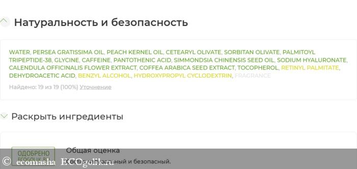 Состав маски просто сказка. Из увлажняющего тут еще есть гиалуроновая кислота, а также противоотечный конский каштан и дающий подтяжку экстракт зеленого кофе. Помимо этого еще альгинат натрия. Поэтому маска действует не хуже альгинатных.