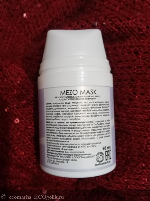 Одна из лучших масок, которую мне посчастливилось попробовать в последнее время, - это ультраувлажняющая маска с фитостволовыми клетками MEZO MASK бренда Matsesta. Маска выраженно увлажняющая и антивозрастная. Она сделана на основе очень эффективного омолаживающего компонента – фитостволовых клеток. Маска веганская, органика на сто процентов. Без химии и всякого вредного в составе.
