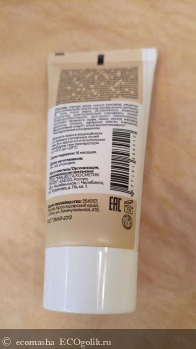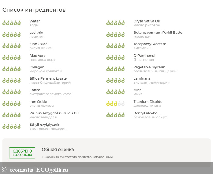 Крем сделан на горной воде. В него добавлен морской коллаген для омоложения кожи, лизат бифидобактерий – для оздоровления кожи, экстракт зеленого кофе – сильный антиоксидант, ламинария – для лифтинга и успокаивающего эффекта. Другие компоненты – оксид цинка, масло ши, масло риса, мика, эфирное масло миндаля и другие. Все они видны на скрине. Состав – одобрен Экоголик.ru.