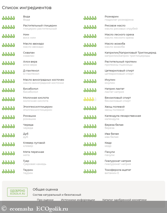 Состав вызывает восхищение. В него включены общие компоненты, полезные для кожи – для увлажнения, ухода. Например, легкие масла (жожоба, виноградной косточки, авокадо, ореха и другие), сквалан, низкомолекулярная гиалуроновая кислота. Также есть компоненты конкретно для снижения проблемности жирной кожи – календула, череда, кора дуба.