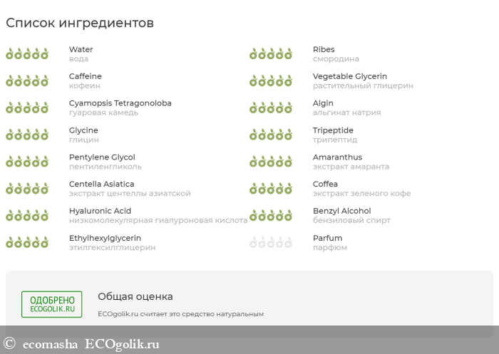 Отдельную оду хочется пропеть составу. Он не просто натуральный, а эффективный. Помимо пептидов для восстановления и омоложения кожи здесь присутствует кофеин, который известен своими подтягивающими свойствами. Мощным тонизирующим действием обладает смородина. Прекрасно успокаивает кожу и усиливает синтез коллагена азиатская центелла. Питательными, регенерирующими, защитными, омолаживающими свойствами обладает амарант.