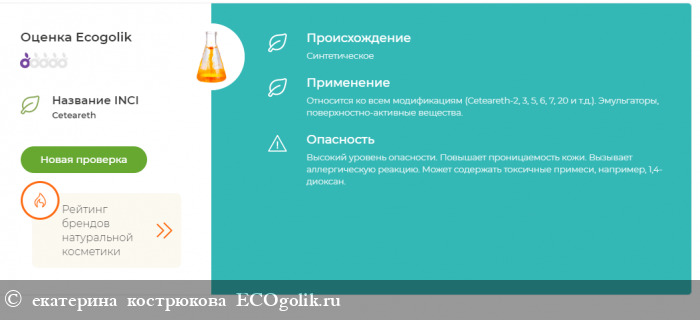 Однако присутствует в составе одно не очень хорошее вещество - цетеарет, которое Экоголик оценил на единицу. За это снижаю оценку всему отзыву.