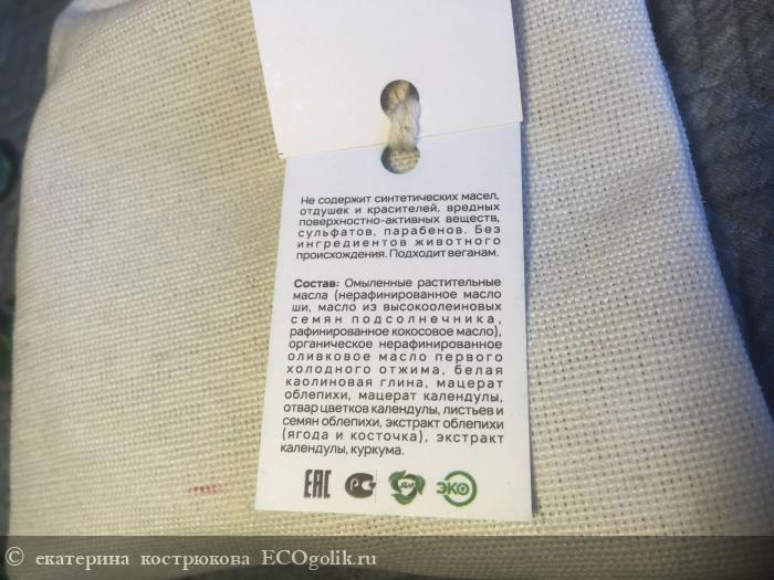 Омыленные растительные масла (нерафинированное масло ши, масло из высокоолеиновых семян подсолнечника, рафинированное кокосовое масло), органическое нерафинированное оливковое масло первого холодного отжима, белая каолиновая глина, мацерат облепихи, мацерат календулы, отвар цветков календулы, листьев и семян облепихи, экстракт облепихи (ягода и косточка), экстракт календулы, куркума.