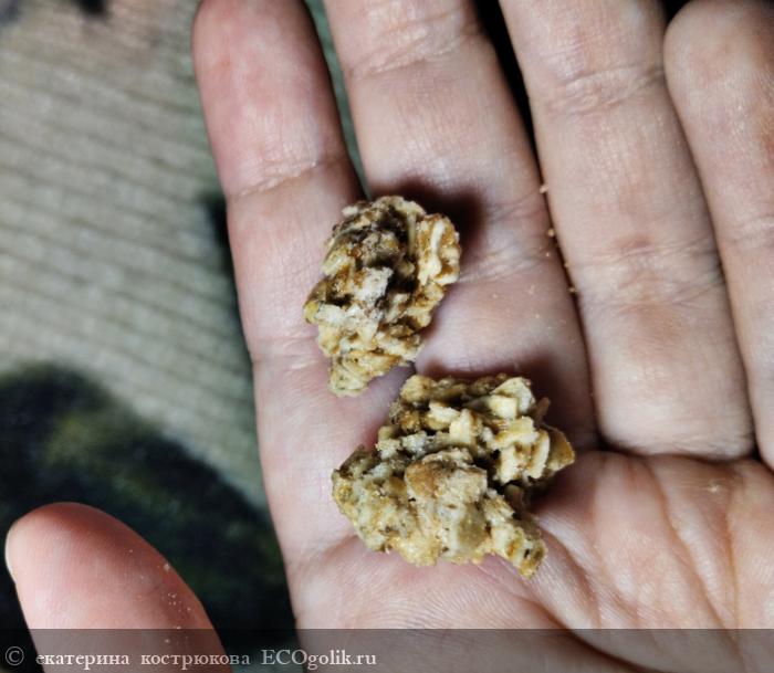 Приятный аромат меда, твердая текстура, бежевый цвет. По текстуре твердые запеченные хлопья овса, скатанные в шарики.