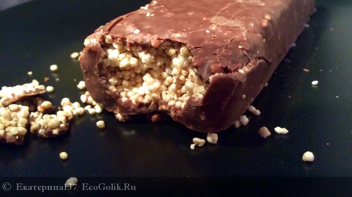 Сверху залит молочным шоколадом, внутри начинка из попкорна, меда и амаранта, выглядит это как много очень маленьких шариков похожих на пенопласт😊это микро попкорн☺️😜 вот я его подковырнула чтобы показать это: