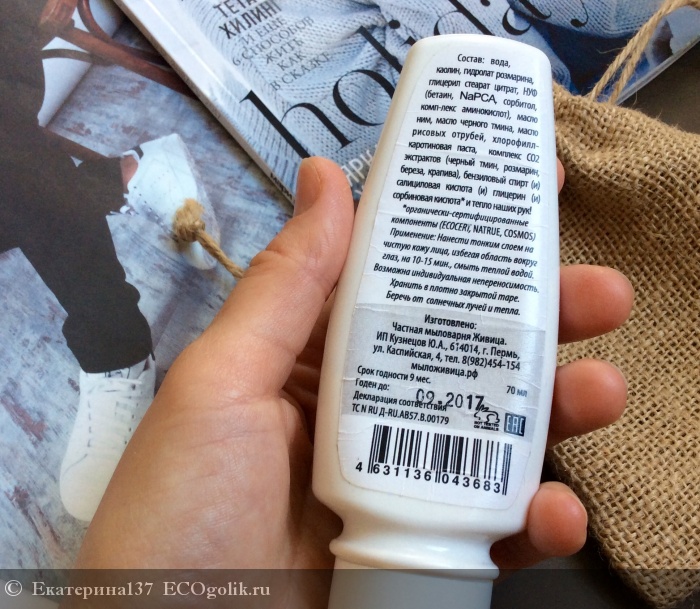 зато воздух не попадает на маску и та не подсыхает. В составе есть глина, но маска кремовая и практически не высыхает за 10-15 минут на коже. Кожу маска совсем не сушит, однако примерно через месяц применения маски у меня кожа стала меньше жирниться, стало меньше появляться блеска на Т-зоне.