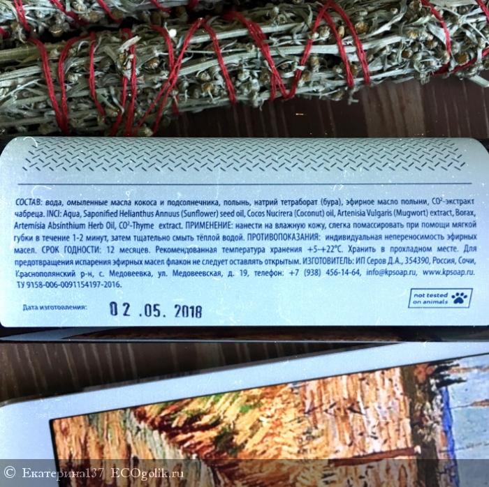 вода, омыленные масла кокоса и подсолнечника, полынь, натрий тетраборат (бура), эфирное масло полыни, СО2-экстракт чабреца.