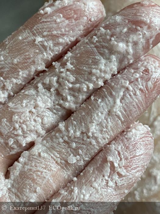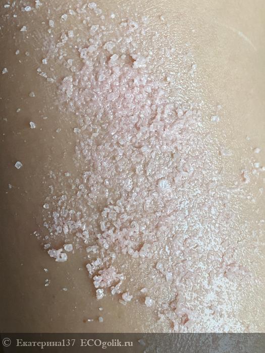 Скраб солевой, учитывайте это, если на коже есть ранки или царапины, он будет щипать. Но это не страшно, так как это обычное свойство соли.