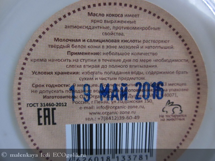 Общая информация. 50 мл – 250 руб., срок годности 9 месяцев (после вскрытия 3 месяца). Производитель – OrganicZone, г.Пенза. Обращу отдельное внимание, что за 3 месяца я крем израсходую 100%-но, поэтому не переживайте, что это мало. Этого срока вполне достаточно, если Вы регулярно ухаживаете за своими ножками, а не вспоминаете о них раз в месяц по большим праздникам. Я свои ножки люблю, мажу их кремом 1, а то и 2-3 раза в день! А вот лишней химии, согласитесь, нам не надо… Меня бы очень насторожило, если бы крем имел срок хранения после вскрытия в течение долгого времени. Ну, опять я ударилась в риторику…