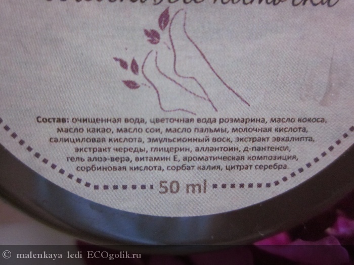 Не расшифрованы некоторые составляющие (масляный экстракт эвкалипта и череды) и сорбат калия, но это не критично, т.к. в натуральности экстрактов я не сомневаюсь, а пресловутый сорбат калия - это один из самых безопасных пищевых консервантов. Если уж в продукты питания его добавляют без вопросов, то в креме для ног вреда от него не будет. В общем и целом, состав отличный, крем можно практически есть, но лучше использовать по назначению.