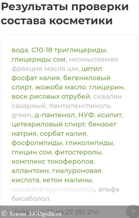 вода, С10-18 триглицериды, глицериды сои (и) неомыляемая фракция масла ши, цетил фосфат калия (и) бегениловый спирт, жожоба масло, глицерин, воск рисовых отрубей, сквалан сахарный, пентиленгликоль green, д-пантенол, НУФ (бетаин, натрий PCA, лактат натрия, пирролидонкарбоновая кислота, серин, аланин, глицин, глутаминовая кислота, лизина гидрохлорид, треонин, аргинин, пролин), ксилит, цетеариловый спирт, бензоат натрия (и) сорбат калия, фосфолипиды (и) гликолипиды (и) глицин сои (и) фитостеролы, комплекс токоферолов, аллантоин, гиалуроновая кислота, кетон малины, пищевой ароматизатор, альфа бисаболол.