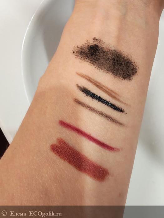 Для меня еще важно, что пенка хорошо смывает макияж. Ею без проблем можно смывать тушь, кожу век пенка не сушит, раздражение глаз не вызывает! Вот, на примере, имеем сверху вниз: тушь, карандаш для бровей, подводка-лайнер для глаз, карандаш для глаз, карандаш для губ и помада