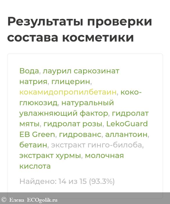 Вода, лаурил саркозинат натрия, глицерин, кокамидопропилбетаин, коко-глюкозид, натуральный увлажняющий фактор, гидролат мяты, гидролат розы, LekoGuard EB Green, гидрованс, аллантоин, бетаин, экстракт гинго-билоба, экстракт хурмы, молочная кислота.