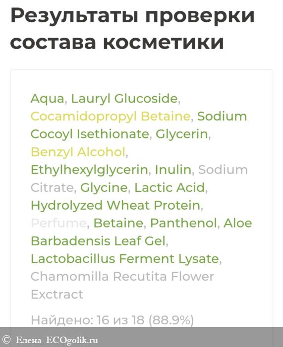 Aqua, Lauryl Glucoside, Cocamidopropyl Betaine, Sodium Cocoyl Isethionate, Glycerin, Benzyl Alcohol, Ethylhexylglycerin, Inulin, Sodium Сitrate, Glycine, Lactic Acid, Hydrolyzed Wheat Protein, Perfume, Betaine, Panthenol, Aloe Barbadensis (Aloe Vera) Leaf Gel, Lactobacillus Ferment Lysate, Chamomilla Recutita Flower Exctract.