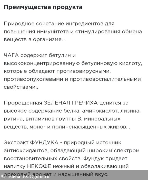 Концентрат из пророщенной ферментированной зеленой гречки, кокосовое молоко сухое, напиток растворимый злаковый ячменный, кукурузная клетчатка, экстракт чаги, цикорий растворимый, сухие сливки, экстракт фундука.