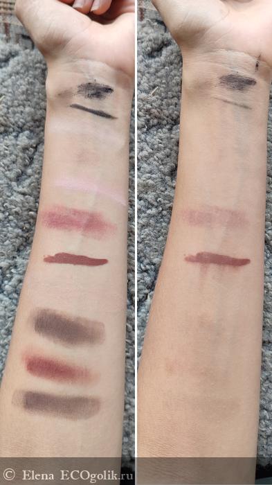 На фото (сверху вниз): тушь (водостойкая), подводка (стойкая ненатуральная), пудра (натуральная), бронзер (натуральный), румяна (натуральные), мультифлюид (натуральный), помада (стойкая ненатуральная), солнцезащиный BB крем (натуральный), трое теней (ненатуральные).