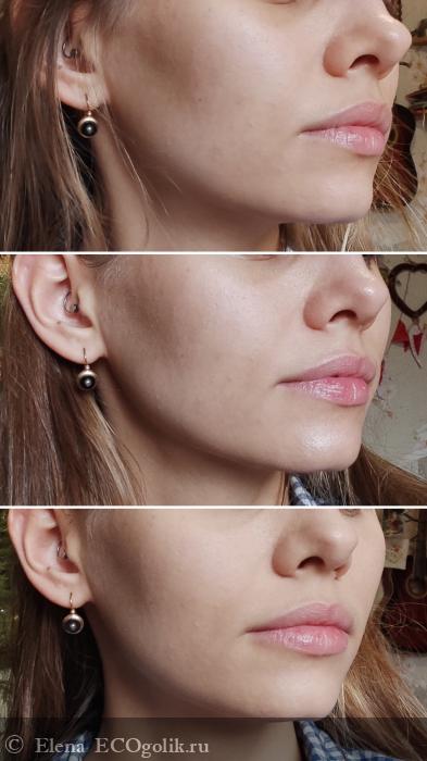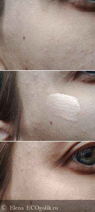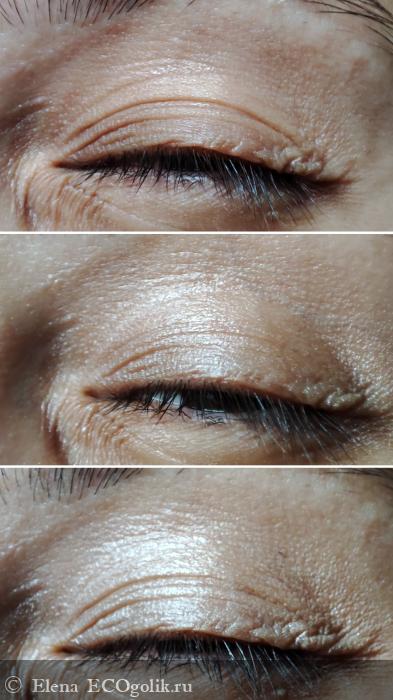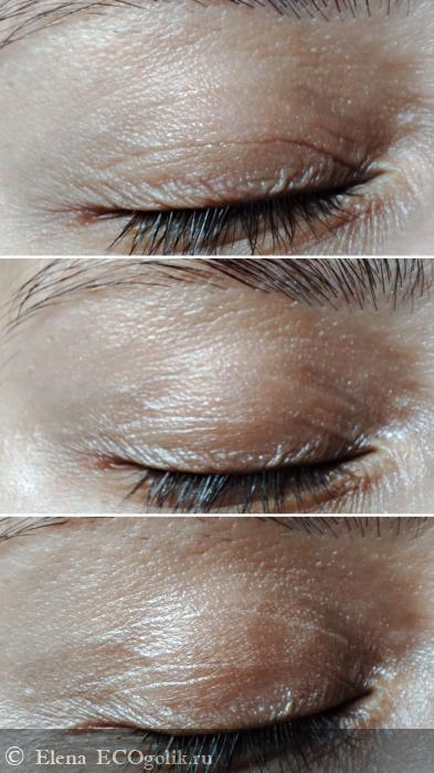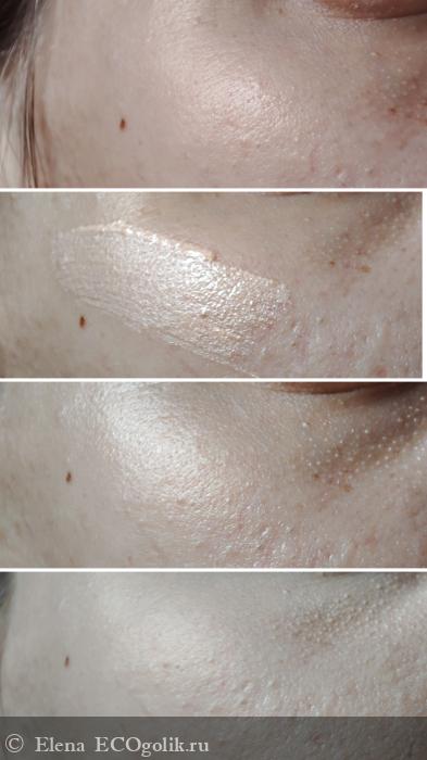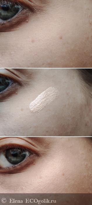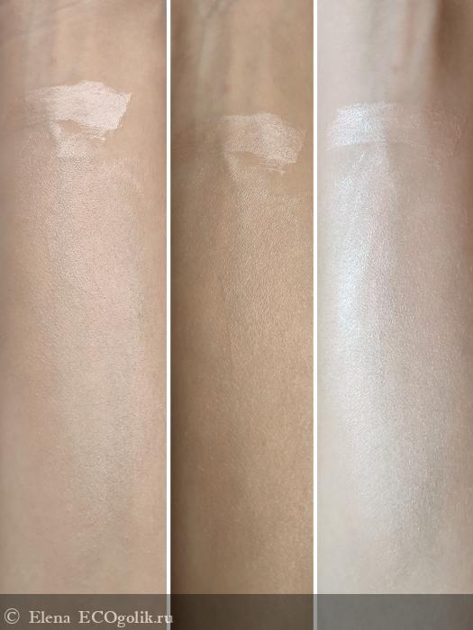 Хайлайтер кремовый, не жирный, размазывается легко, на застывание нужно немного времени, текстура однородная. Красивый жемчужный цвет, отдельных блёсток нет! Думаю, когда я наносила его почти на всё лицо, слегка переборщила, но пудра поверх легла хорошо, не залипла и не запала. Такой метод на ежедневной основе не для меня, скорее праздничный вариант, очень много косметики. Выступающие части более подчёркнуты и кожа светится будто изнутри. Моя комбинированная кожа спустя время стала чуть жирнее, но не критично. Продукт невесомый, не ощущается. Можно сделать деликатное сияние, очень естесственное, но можно нанести больше сразу или наслоить и оно станет ярче. При комбинации хайлайтер + пудра + хайлайтер (какой-то огромный бутерброд) текстуру видно только на макро, в жизни, даже если близко смотреть в зеркало смотрится всё очень красиво. При обычном нанесении тем более: текстуры не видно вообще, зато видно красивое естественное сияние. Единственное, не рекомендую наносить его на глаза: почему-то он там не хочет застывать, не важно, много вы нанесете или мало, а потом вообще скатывается в складочки. Зато в остальном он просто чудесный!