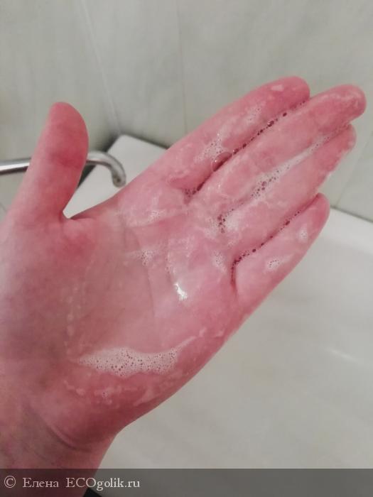 На фото можно заметить ,что для безсульфатного шампуня он прекрасно пенится, что делает шампунь очень экономичным. На помывку мне хватает 4 намыливания, но это потому что я люблю побольше пены, чисто психологически считаю, что так лучше промоется голова, а может просто привычка с сульфатных осталась. Расход у него оооочень экономичный. После нескольких использований брусочек существенно не уменьшился, что и позволяет сделать данный вывод.