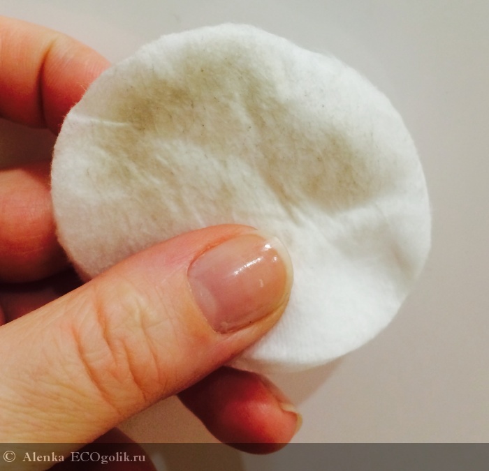 Молочко выдавливаю в небольшом количестве (как на фото ниже) на ватный диск и очищаю им лицо, а также шею. После его водой не смываю, так как сейчас с ней совсем "не дружу"
