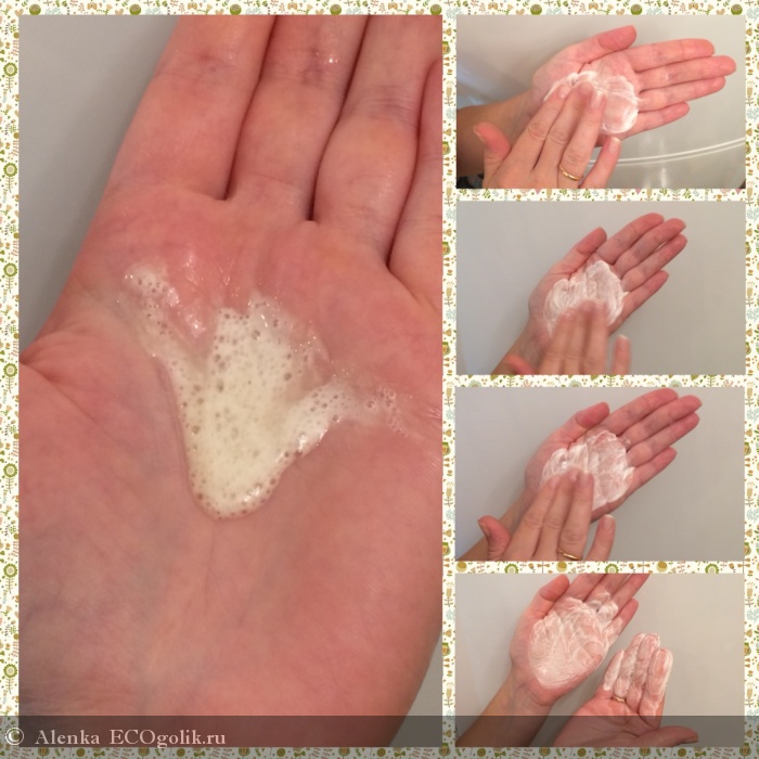 Для этого нанесем немного крема на руку (кстати, крема нужно действительно немного, средство очень экономичное), второй рукой начнем водить по ладони с кремом, взбивая пену. Ладонь должна быть влажная. В процессе взбивания можно добавить еще немного воды, буквально капли.