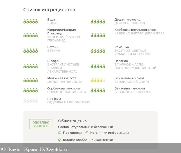 СОСТАВ: ВОДА, ДЕЦИЛ ГЛЮКОЗИД, КАПРИЛИЛ/КАПРИЛ ГЛЮКОЗИД, КАРБОКСИМЕТИЛЦЕЛЛЮЛОЗА, БЕТАИН, ЭКСТРАКТ ЦВЕТКОВ РОМАШКИ АПТЕЧНОЙ, ЭКСТРАКТ ЛИСТЬЕВ ШАЛФЕЯ ЛЕКАРСТВЕННОГО, ЭФИРНОЕ МАСЛО ЛАВАНДЫ УЗКОЛИСТНОЙ, МОЛОЧНАЯ КИСЛОТА, БЕНЗИЛОВЫЙ СПИРТ, СОРБИНОВАЯ КИСЛОТА, БЕНЗОЙНАЯ КИСЛОТА, ОТДУШКА ПАРФЮМЕРНАЯ.