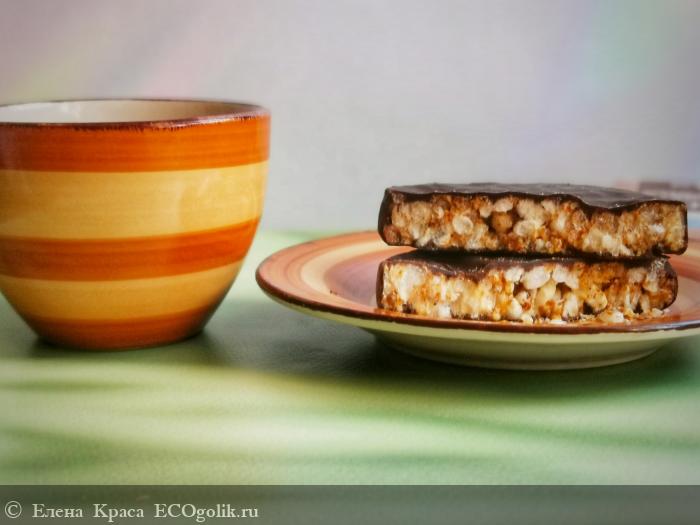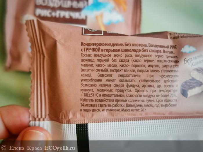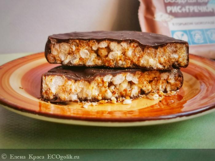 - Вкус у снека приятный, Воздушные зерна риса и гречихи хрустят. Шоколад имеет благородную горчинку и насыщенный вкус.