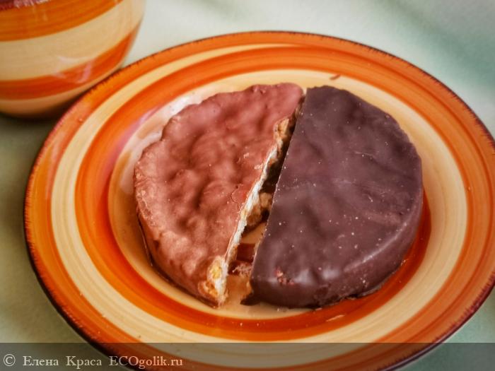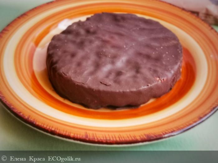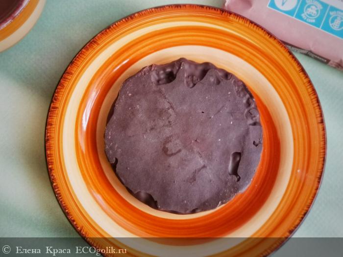 Снек правильной круглой формы. Равномерно покрыт слоем тёмного шоколада. Мне показалось, что у десерта с горьким шоколадом слой шоколада более плотный, чем у молочного.