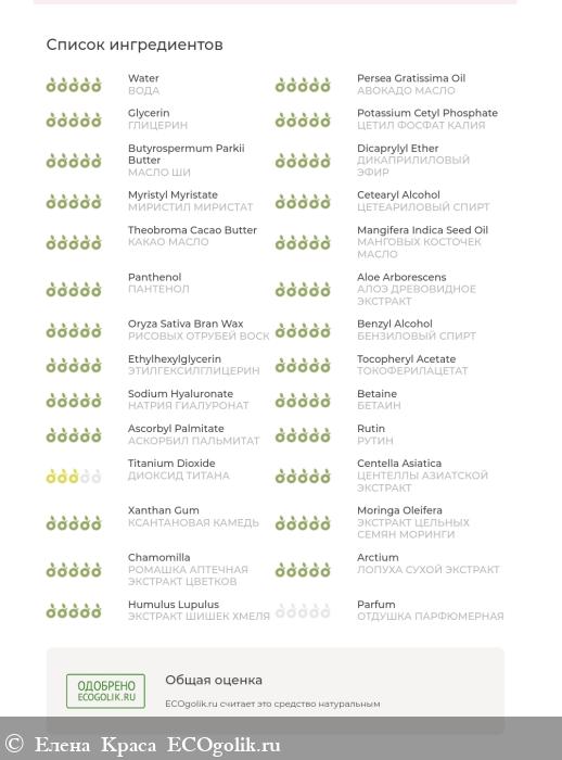 Состав: ВОДА, АВОКАДО МАСЛО, ГЛИЦЕРИН, ЦЕТЕАРИЛОВЫЙ СПИРТ, ЦЕТИЛ ФОСФАТ КАЛИЯ, МАСЛО ШИ (КАРИТЭ), ДИКАПРИЛИЛОВЫЙ ЭФИР, МИРИСТИЛ МИРИСТАТ, ЦЕТЕАРИЛОВЫЙ СПИРТ, КАКАО МАСЛО, МАНГОВЫХ КОСТОЧЕК МАСЛО, ПАНТЕНОЛ, АЛОЭ ДРЕВОВИДНОЕ ЭКСТРАКТ, РИСОВЫХ ОТРУБЕЙ ВОСК, БЕНЗИЛОВЫЙ СПИРТ, ЭТИЛГЕКСИЛГЛИЦЕРИН, ТОКОФЕРИЛАЦЕТАТ, НАТРИЯ ГИАЛУРОНАТ, БЕТАИН, АСКОРБИЛ ПАЛЬМИТАТ (ВИТАМИН C), РУТИН (ВИТАМИН P), ДИОКСИД ТИТАНА, ЦЕНТЕЛЛЫ АЗИАТСКОЙ ЭКСТРАКТ, КСАНТАНОВАЯ КАМЕДЬ, ЭКСТРАКТ ЦЕЛЬНЫХ СЕМЯН МОРИНГИ, РОМАШКА АПТЕЧНАЯ ЭКСТРАКТ ЦВЕТКОВ, ЛОПУХА СУХОЙ ЭКСТРАКТ, ЭКСТРАКТ ШИШЕК ХМЕЛЯ, ОТДУШКА ПАРФЮМЕРНАЯ.