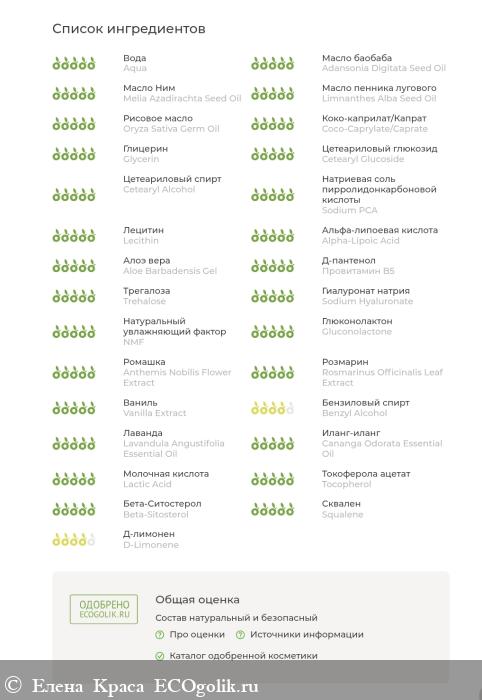 Аqua (Вода подготовленная),; Lavandula Angustifolia Flower Distillate Water (Гидролат цветов лаванды узколистной); Adansonia Digitata Seed Oil (Масло баобаба), Melia Azadirachta Seed Oil (Масло ним); Limnanthes Alba Seed Oil (Масло пенника лугового); Oryza Sativa (Rice) Germ Oil (Масло Рисовых Отрубей); Coco-Caprylate/Caprate (Коко-каприлат/капрат), Glycerin (Глицерин); Cetearyl Glucoside and Cetearyl Alcohol (Цетеариловый глюкозид и цетеариловый спирт); Sodium PCA (Натриевая соль пирролидонкарбоновой кислоты), Lecithin (Лецитин соевый); Alpha-Lipoic Acid (Альфа-липоевая кислота), Aloe Barbadensis (Aloe Vera) Gel (Алоэ вера гель); Pantothenic Аcid (Провитамин B5), Trehalose (Трегалоза), Sodium Hyaluronate (Гиалуроновая кислота); NMF (Sodium Lactate, Arginine, Aspartic Acid, PCA, Glycine, Alanine, Serine, Valine, Proline,; Threonine, Isoleucine, Histidine, Phenylalanine) (НУФ-Натуральный увлажняющий фактор),; Gluconolactone (Дельта-глюконолактон); Anthemis Nobilis (Chamomile) Flower Extract (СО2 экстракт ромашки); Rosmarinus Officinalis (Rosemary) Leaf Extract (CO2 экстракт розмарина); Vanilla Extract (СО2 Экстракт ванили), Benzyl Alcohol (Бензиловый спирт);Lavandula Angustifolia (Lavender) Essential Oil (Эфирное масло лаванды); Cananga Odorata Essential Oil (Эфирное масло иланг-иланга), Lactic Acid (Кислота молочная); Tocopherol (Mixed), Beta-Sitosterol; Squalene (Антиоксидантный комплекс), D-Limonene (Д-лимонен).