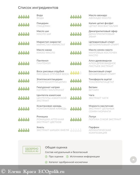 СОСТАВ: ВОДА, АВОКАДО МАСЛО, ГЛИЦЕРИН, ЦЕТЕАРИЛОВЫЙ СПИРТ, ЦЕТИЛ ФОСФАТ КАЛИЯ, МАСЛО ШИ (КАРИТЭ), ДИКАПРИЛИЛОВЫЙ ЭФИР, МИРИСТИЛ МИРИСТАТ, ЦЕТЕАРИЛОВЫЙ СПИРТ, КАКАО МАСЛО, МАНГОВЫХ КОСТОЧЕК МАСЛО, ПАНТЕНОЛ, АЛОЭ ДРЕВОВИДНОЕ ЛИСТЬЕВ ЭКСТРАКТ, РИСОВЫХ ОТРУБЕЙ ВОСК, БЕНЗИЛОВЫЙ СПИРТ, ЭТИЛГЕКСИЛГЛИЦЕРИН, ТОКОФЕРИЛАЦЕТАТ, НАТРИЯ ГИАЛУРОНАТ, БЕТАИН, ЦЕНТЕЛЛЫ АЗИАТСКОЙ ЭКСТРАКТ, ЭКСТРАКТ ЧАГИ, КСАНТАНОВАЯ КАМЕДЬ, ЭКСТРАКТ ЦЕЛЬНЫХ СЕМЯН МОРИНГИ, РОМАШКА АПТЕЧНАЯ ЭКСТРАКТ ЦВЕТКОВ, ЛОПУХА СУХОЙ ЭКСТРАКТ, ЭКСТРАКТ ШИШЕК ХМЕЛЯ, АРОМАТИЧЕСКАЯ КОМПОЗИЦИЯ.