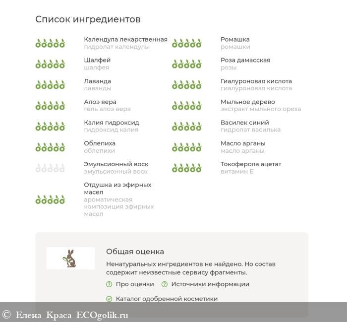 Состав: гидролат календулы, отвары маклюры, ромашки, шалфея, розы, лаванды, гиалуроновая кислота, гель алоэ вера, экстракт мыльного ореха, гидроксид калия, гидролат василька, масла ореха макадамии, облепихи, масло арганы, эмульсионный воск, витамин Е, ароматическая композиция эфирных масел.