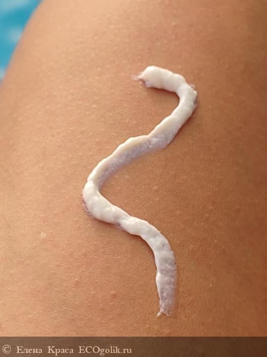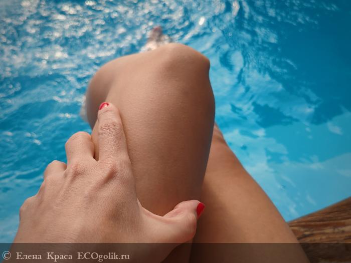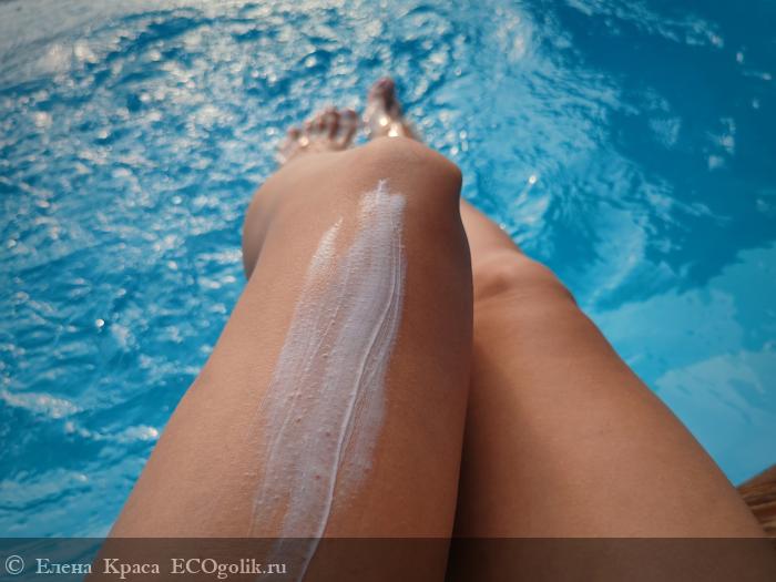 После бассейна, а затем принятия душа я нанесла крем не только на потенциально сухие участки кожи, но и на кожу бёдер. (Так как после хлорированной воды меня беспокоило чувство лёгкой стянутости кожи.)