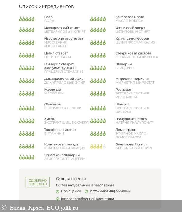 СОСТАВ: ВОДА, МАСЛО КОКОСА, ЦЕТЕАРИЛОВЫЙ СПИРТ, ЦЕТИЛОВЫЙ СПИРТ, ИЗОСТЕАРИЛ ИЗОСТЕАРАТ, ЦЕТИЛ ФОСФАТ КАЛИЯ, ЦЕТИЛ СТЕАРАТ, СТЕАРИНОВАЯ КИСЛОТА, ГЛИЦЕРИЛ СТЕАРАТ SE, ГЛИЦЕРИН, ДИКАПРИЛОВЫЙ ЭФИР, МИРИСТИЛ МИРИСТАТ, МАСЛО ШИ, ЭКСТРАКТ ЛИСТЬЕВ РОЗМАРИНА, ЭКСТРАКТ ОБЛЕПИХИ, ЭКСТРАКТ ЛИСТЬЕВ ШАЛФЕЯ, ЭКСТРАКТ ШИШЕК ХМЕЛЯ, НАТРИЯ ГИАЛУРОНАТ, ВИТАМИН Е, ЭФИРНОЕ МАСЛО ЛЕМОНГРАССА, КСАНТАНОВАЯ КАМЕДЬ, БЕНЗИЛОВЫЙ СПИРТ, ЭТИЛГЕКСИЛГЛИЦЕРИН