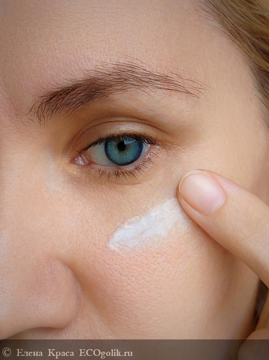 Я наношу крем на кожу лица лёгкими массажными движениями, в том числе и на нежную кожу вокруг глаз.