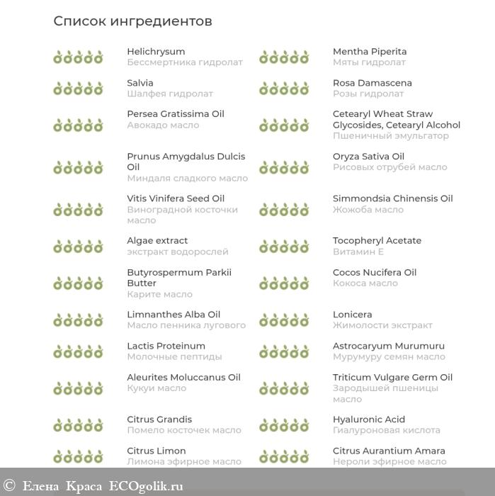 Состав: Бессмертника гидролат, Мяты гидролат, Шалфея гидролат, Розы гидролат, Авокадо масло, Пшеничный эмульгатор, Миндаля сладкого масло, Рисовых отрубей масло, Виноградной косточки масло, эмульгатор Экогель, Жожоба масло, экстракт водорослей(голубой ретинол), Органических ростков подсолнечника экстракт, Витамин Е, Карите масло, Кокоса масло, Органических листьев альпийской розы экстракт, Масло пенника лугового, Жимолости экстракт, Альпийской розы стволовые клетки, Молочные пептиды, Cливовых косточек масло, Масло семян тутовника, Масло семян Розы Москеты, Мурумуру семян масло, Кукуи масло, Зародышей пшеницы масло, Помело косточек масло, Гиалуроновая кислота, Лимона эфирное масло, Нероли эфирное масло.