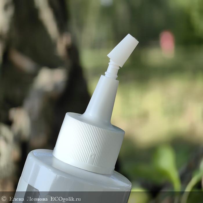 Флакончик белый, словно облачко, готовый забрать всю грязь. Длинный тоненький носик – настоящая волшебная палочка. На белой этикетке – секретное послание, рассказывающее о чудесных свойствах продукта, способе применения и др. Название бренда, выведенное большими буквами – знак качества, подчеркивающее его мощь. Флакон — волшебный помощник, который помогает открыть прекрасные стороны моих локонов.