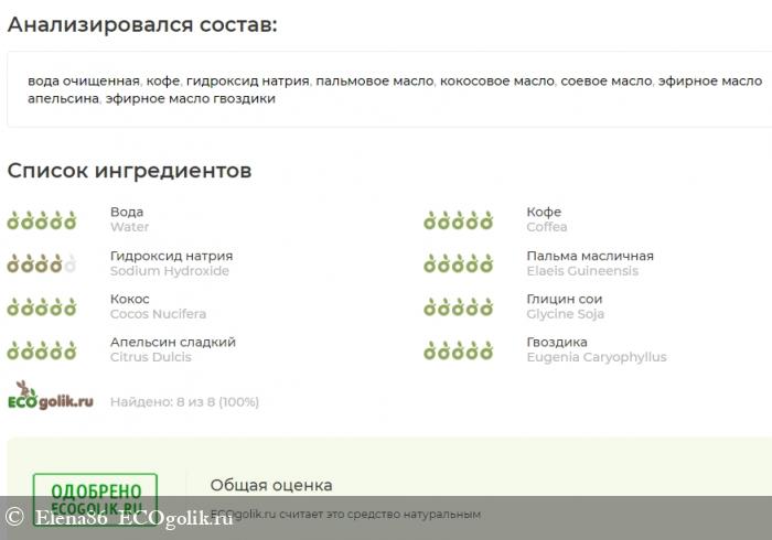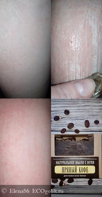После нескольких применений становятся отчетливо ощутимы кофейные частицы в мыле, они расположены равномерно и отлично скрабируют и массируют кожу. Отчетливо видны зоны массирования, проявляется это в виде покраснения кожи. На тех зонах, где кожа особенно тонкая и нежная скрабировать немного больно, частицы кофе для таких зон грубоваты.