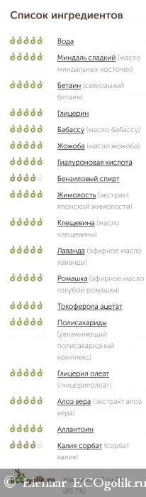 Вода, масло миндальных косточек, свекольный бетаин, глицерин, фосфолипиды овса, масло бабассу, масло жожоба, гиалуроновая кислота, бензиловый спирт, экстракт японской жимолости, масло клещевины, эфирное масло лаванды, эфирное масло голубой ромашки, токоферола ацетат (витамин Е), глюкозиды природных жирных кислот (кокоглюкозиды), увлажняющий полисахаридный комплекс, глицерилолеат, экстракт алоэ вера, комплекс полиненасыщенных высших жирных кислот (витамин F), аллантоин, сорбат калия