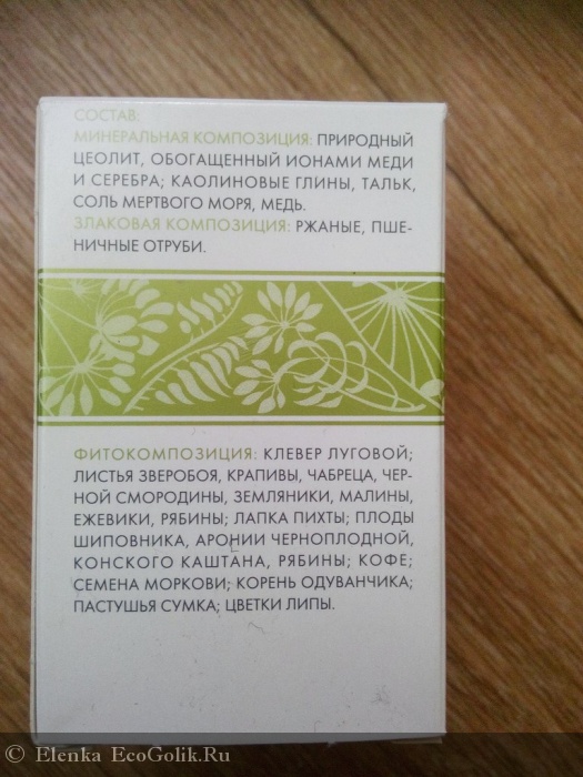 Состав: Минеральная композиция: природный цеолит, обогащенный ионами меди и серебра; каолиновые глины, тальк, соль Мертвого моря, медь.Злаковая композиция: ржаные и пшеничные отруби. Фитокомпозиция: клевер луговой; листья зверобоя, крапивы, чабреца, черной смородины, земляники, малины, ежевики, рябины; лапка пихты, плоды шиповника, аронии черноплодной, конского каштана, рябины; кофе; семена моркови; корень одуванчика; пастушья сумка; цветки липы.