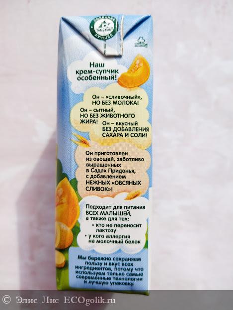 Пачка удобного формата тетра-пак, весит немного и удобно хранить. На пачке указан срок годности, состав и полезные свойства продукта. Давать такой крем-супчик рекомендуется с 6 месяцев.